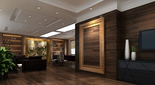 雖然這里的裝修很簡單,但這也是最好的裝修的表達的方式,此例辦公室裝修的色彩采用非常嚴謹的顏色,米黃色的地磚,表達有能量、權威的整體形象,兩邊的藝術工藝品用來表現辦公裝修的精湛之余的時尚與潮流。